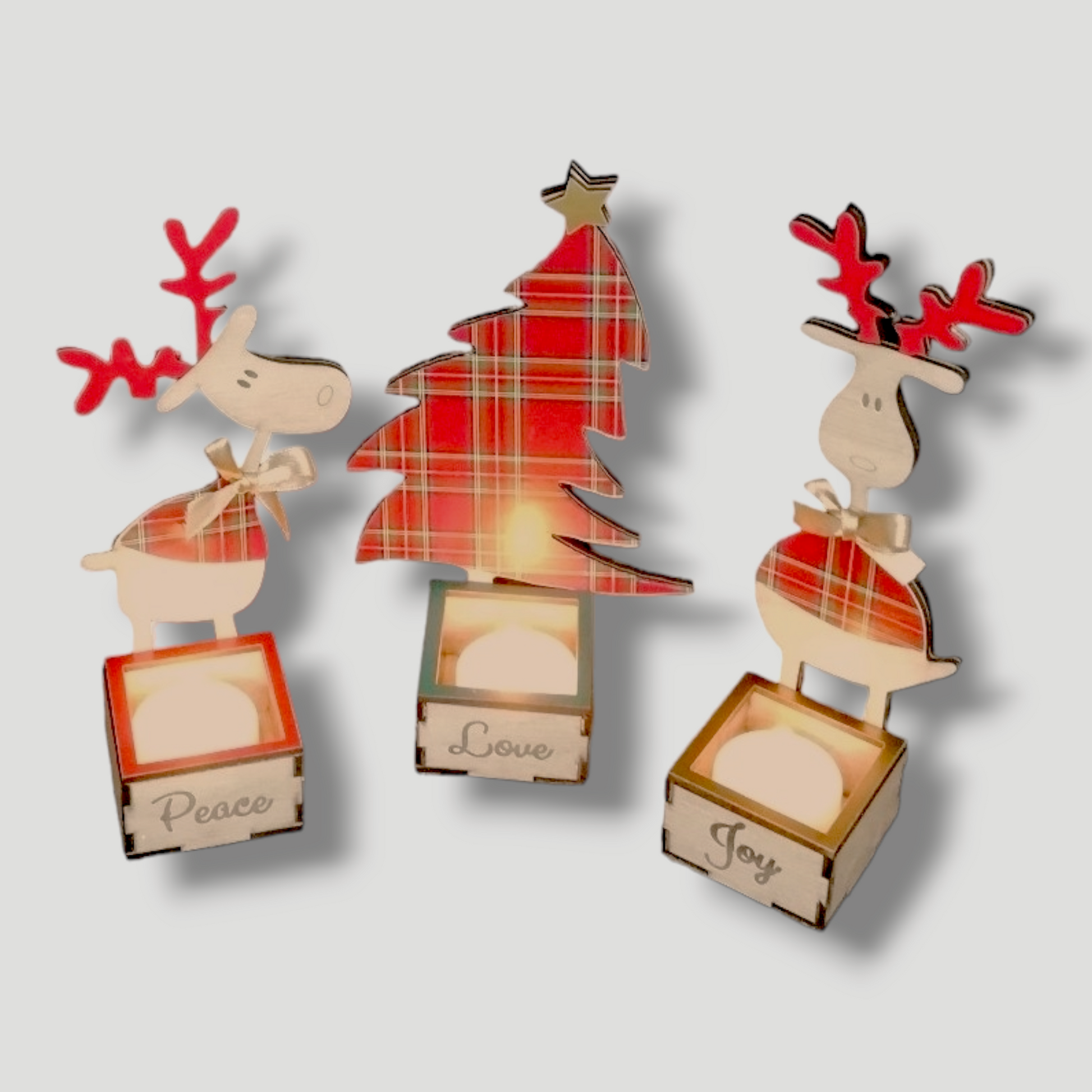 Candle holder: Plaid wooden reindeer and tree (set of 3)