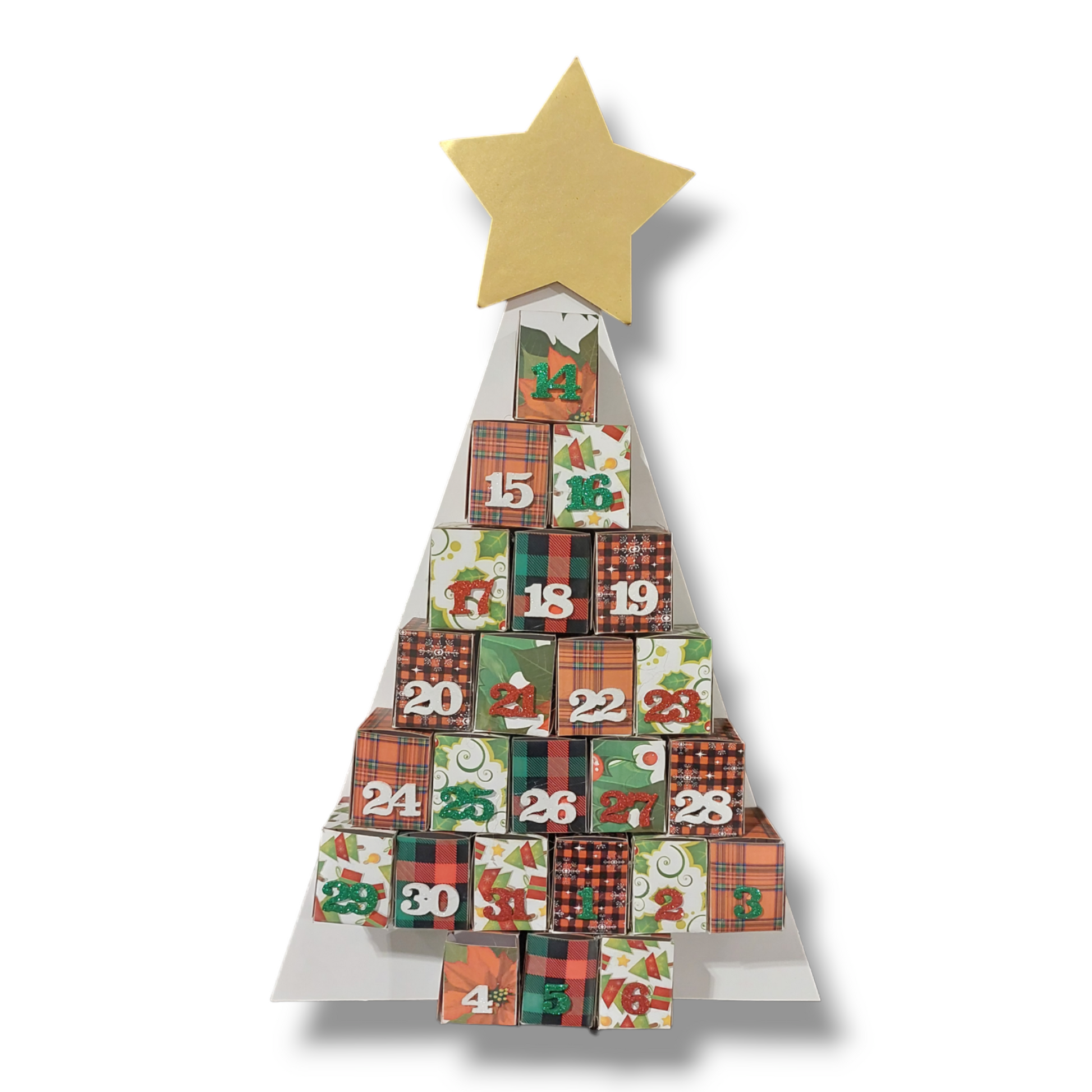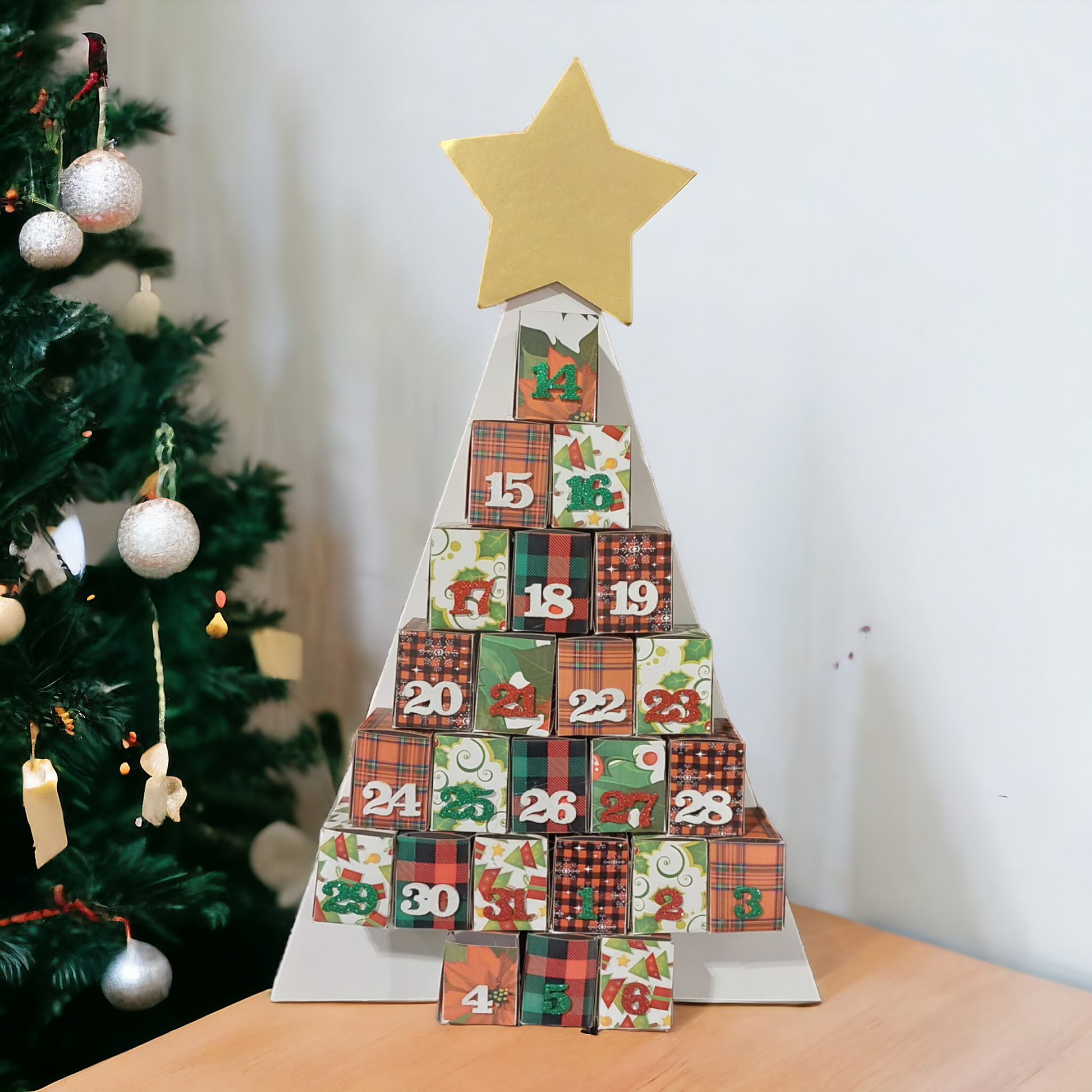 Cardboard boxes advent calendar for each day of the month. Glued on a tree shaped cardboard to be hung on the wall or placed on a table.