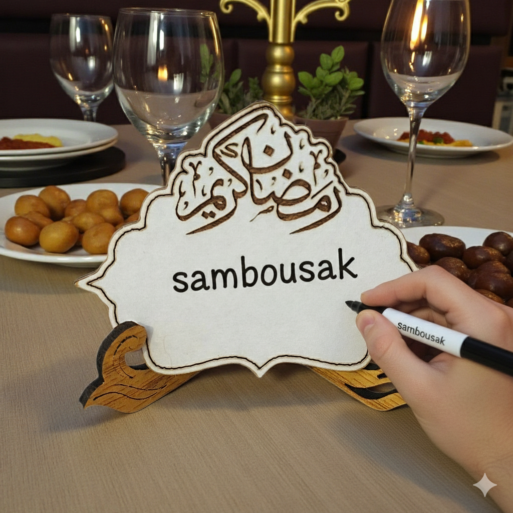 Forget disposable paper cards! This eco-friendly stand can be used night after night. Simply write the dish name—from "Lentil Soup" to "Kunafa"—and wipe it clean once the meal is over. Its scrolled, artistic base ensures stability while adding a touch of artisanal craft to your decor.