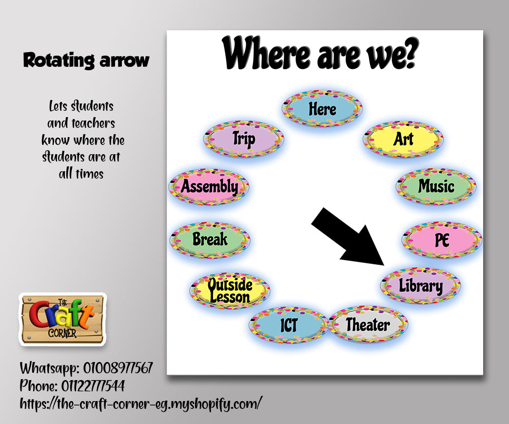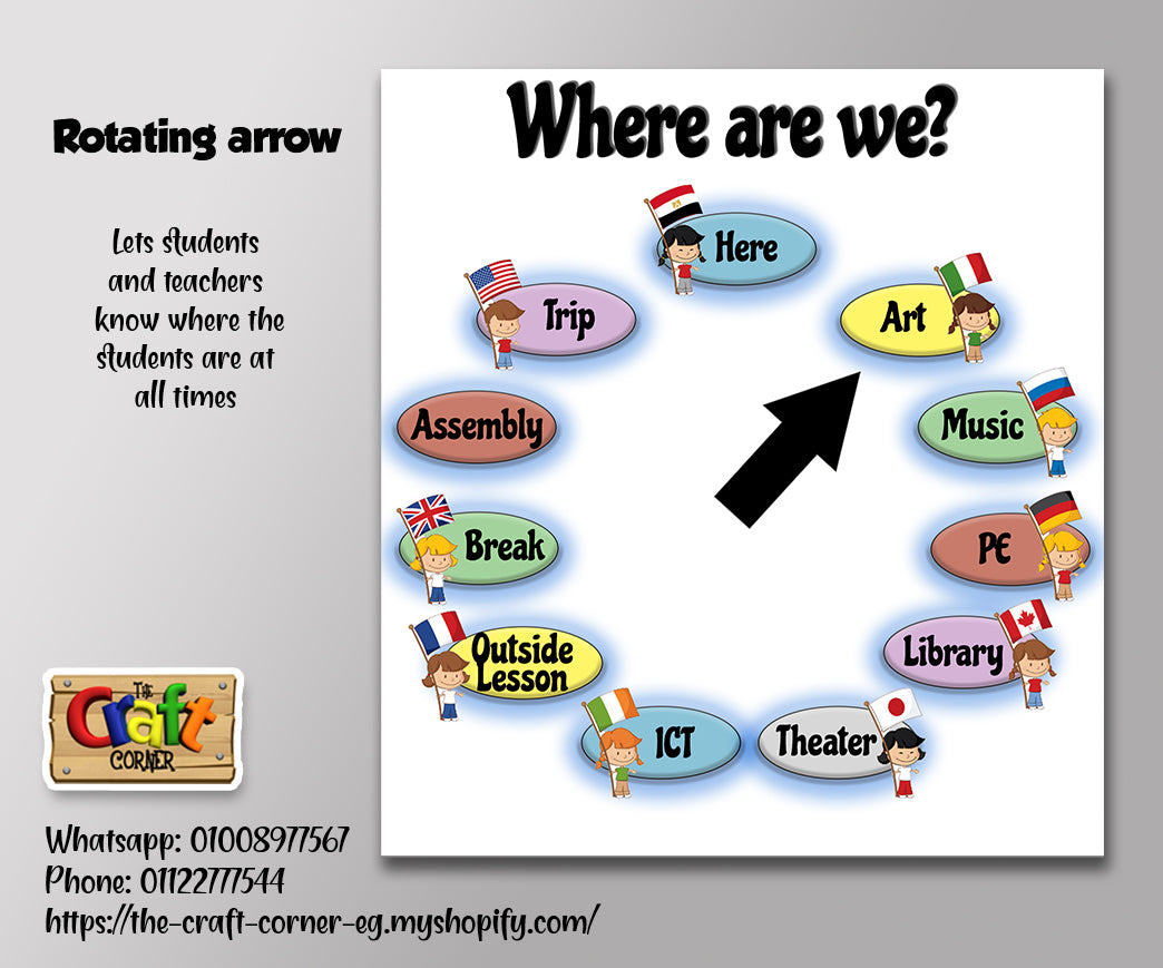 32x32 laminated chart with a wooden arrow to point to where the students are at all times.