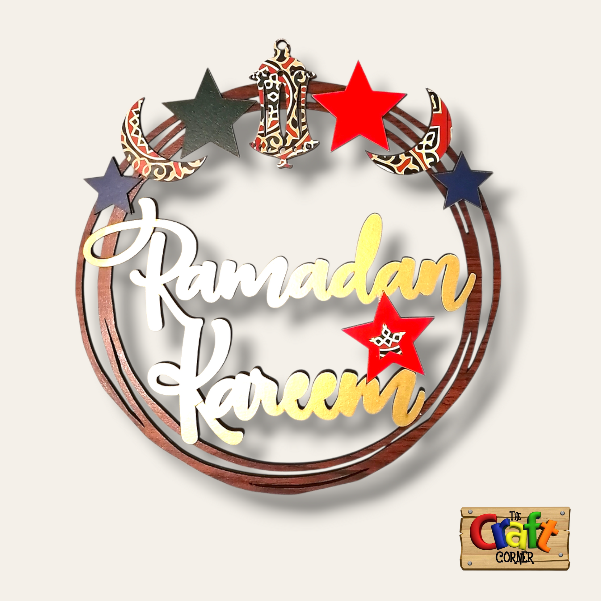 Each wreath is meticulously crafted from high-quality wood, featuring a layered 3D design that adds depth and character to your decor. Measuring 25 cm in diameter, it is the ideal size for apartment doors, interior walls, or as a focal point in a Ramadan gallery display.