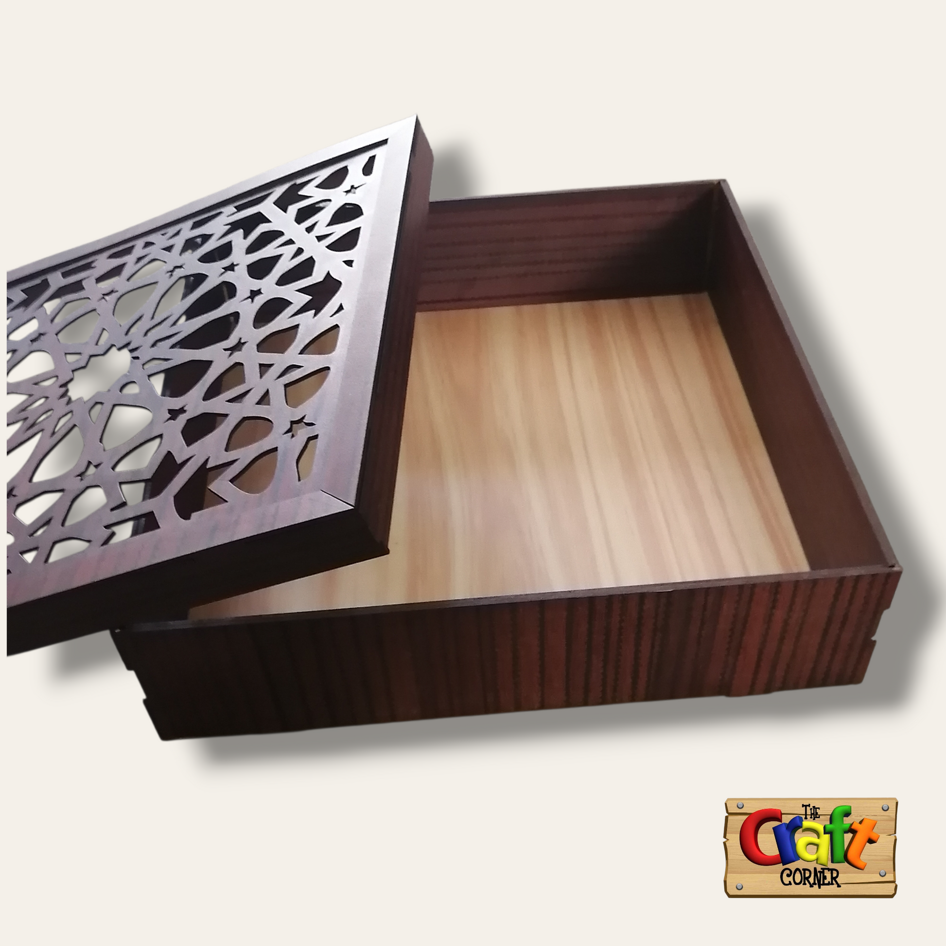 This 30x30 cm box is designed with intricate, multi-layered wooden details. The lid features high-contrast geometric Islamic patterns and precision-cut Kufic calligraphy, creating a stunning 3D texture that honors traditional architectural motifs.